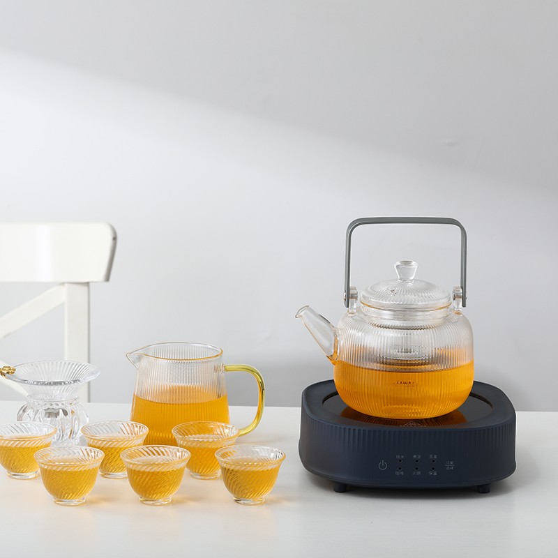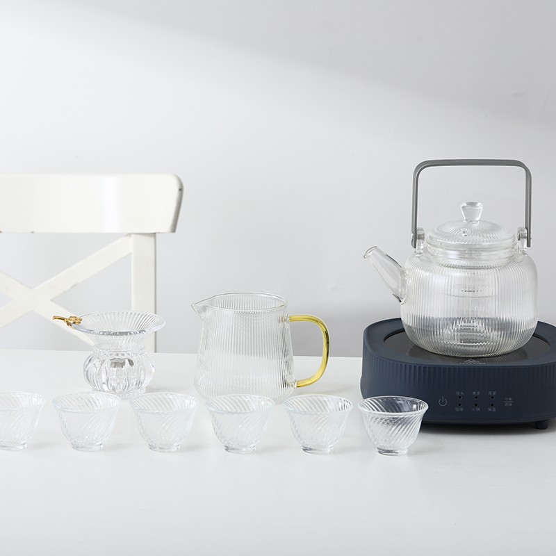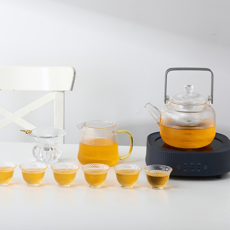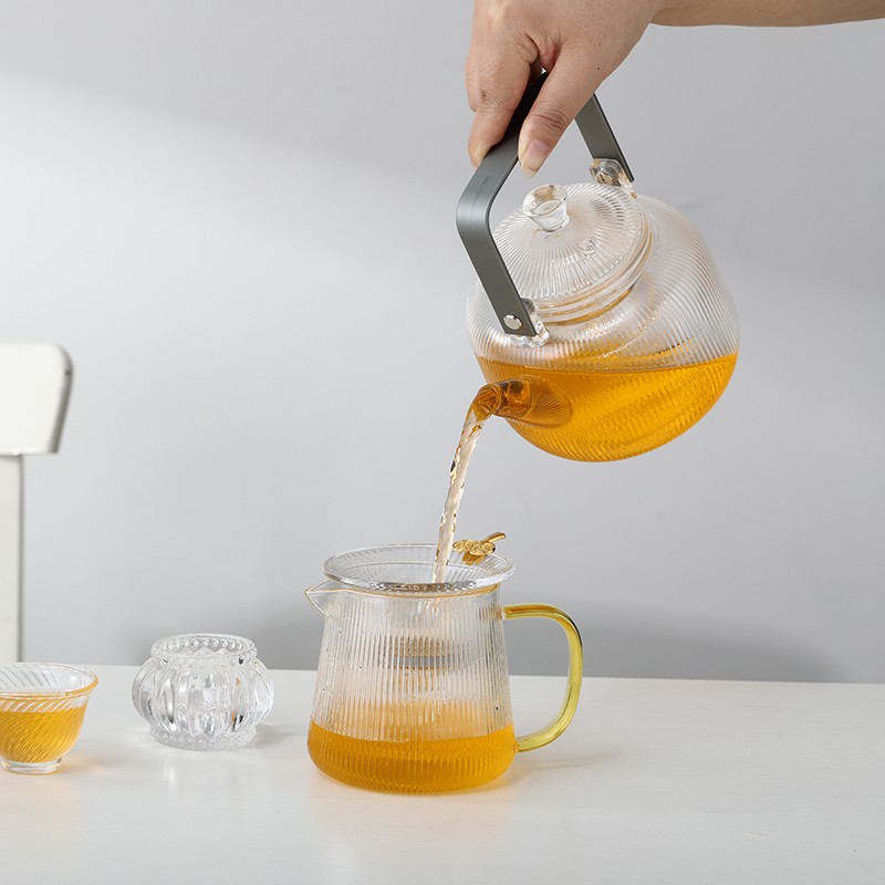 क्रिस्टल ग्लास चहाचा सेट उच्च-गुणवत्तेच्या बोरोसिलिकेट ग्लासचा बनलेला आहे, जो पर्यावरणास अनुकूल आणि सुरक्षित आहे. क्रिस्टल प्रकाश, सुंदर आणि व्यावहारिक, हुशार डिझाइनसह, उष्णता-प्रतिरोधक टीपॉट विविध चहाच्या पानांना योग्यरित्या सामावून घेऊ शकते, ज्यामुळे ते अधिक सुंदर दिसते आणि वेगवेगळ्या लोकांच्या आणि आकारांच्या गरजा पूर्ण करते. चहा ठेवण्यासाठी आणि कपमध्ये ओतण्यासाठी सोयीस्कर, मोठ्या काचेच्या हँडलमुळे चहाची भांडी पकडणे आणि पाणी ओतणे इतके सोपे होते. पूर्णपणे स्वच्छ काचेचे आणि शोभिवंत शीर्ष काचेचे झाकण, तसेच चहा देण्यासाठी काचेचा ट्रे, त्याला एक सुंदर आणि आधुनिक रूप देतात. या उष्णता-प्रतिरोधक टीपॉटसह तुमचा आवडता चहा बनवा आणि स्टेनलेस स्टील किंवा प्लास्टिकच्या चवीशिवाय स्वादिष्ट चवचा आनंद घ्या. तुम्हाला ब्लॅक टी, ग्रीन टी, व्हाईट टी, ओलॉन्ग टी, प्युअर टी किंवा इतर हर्बल टी बनवायचे असले तरी, हे प्रीमियम ग्लास टीपॉट तुमच्या चहाचे सूक्ष्म स्वाद काढते. त्याची थर्मल स्थिरता चांगली आहे आणि ते -20°C ते 150°C पर्यंत तापमानात अचानक होणाऱ्या बदलांना तोंड देऊ शकते. त्यामुळे तुम्ही उष्मा-प्रतिरोधक टीपॉट वापरू शकता थंड आणि गरम दोन्ही पेये कोणत्याही समस्येशिवाय बनवण्यासाठी! INTOWAK चीनी स्त्रोत ग्लास निर्माता