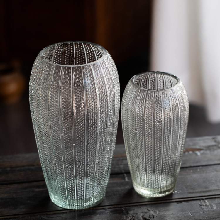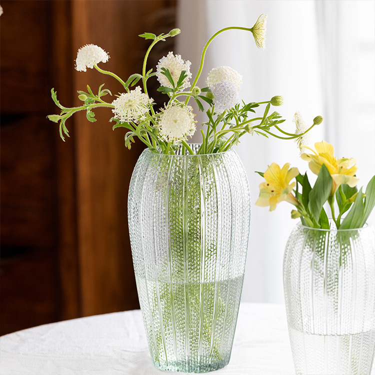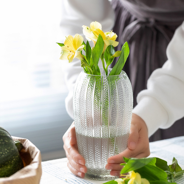 युरोपियन शैलीतील रिलीफ ग्लास फुलदाणी आणि सुंदर पुष्पगुच्छ रोमँटिक आणि सुंदर मूड तयार करतात. उच्च बोरोसिलिकेट काचेची बनलेली बासरीयुक्त काचेची फुलदाणी बऱ्याच प्रसंगांसाठी योग्य आहे, सोफ्यावर झुका, मोहक संगीत ऐका, पुष्पगुच्छाच्या सौंदर्याची प्रशंसा करा, शांततेचा आस्वाद घ्या आणि सुंदर रोमँटिक वातावरणाचा आनंद घ्या. INTOWAK चीन च्या स्त्रोत ग्लास उत्पादक!