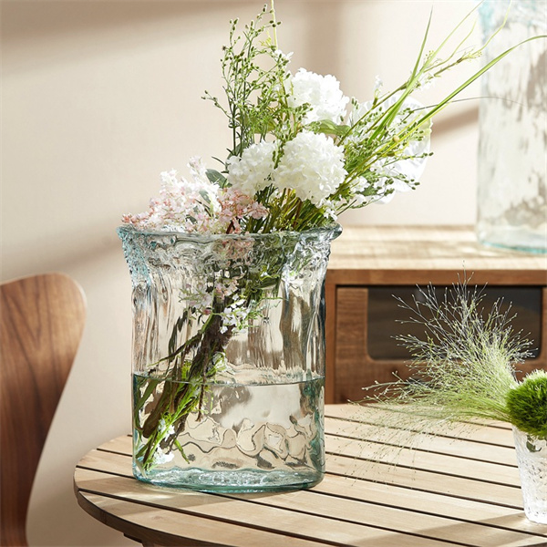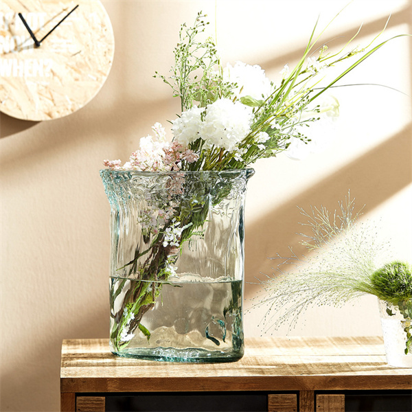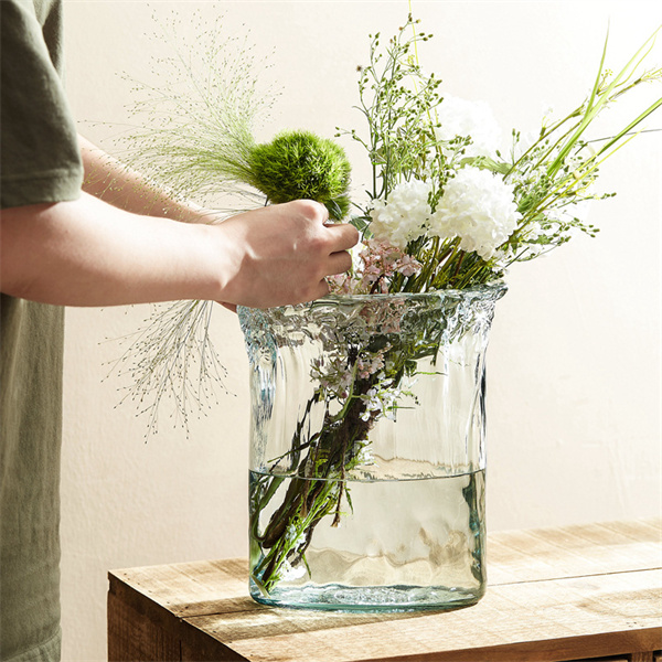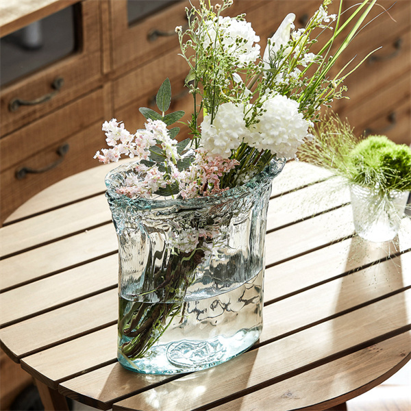 अनियमित डिझाइन, नॉर्डिक शैलीतील अंडाकृती काचेची फुलदाणी, पृष्ठभागावर अनियमित सुव्यवस्थित हॅमर पोत, प्रकाश आणि सावली अंतर्गत उत्कृष्ट आणि स्पष्ट, यादृच्छिकपणे लहान फुलांनी जुळलेले, कलात्मक संकल्पनेने परिपूर्ण, जीवनात कलात्मक रंग जोडणारे, बाटलीच्या तोंडाचा लहरी आकार रोमँटिक कोपरा तयार करण्यासाठी घट्ट केले जाते. बाटलीच्या तोंडाचा लहरी पोत एक मनोरंजक घरगुती जीवन तयार करतो आणि एकूणच जाड डिझाइनमुळे ते स्थिर होते. फुलदाणीमध्ये ठेवलेली फुले सावली आणि डोलणारी असतात. घरी असो किंवा ऑफिसमध्ये, सुकलेली फुले आणि ताजी फुले फुलदाणीमध्ये दोन किंवा तीन तुकड्यांमध्ये ठेवता येतात. किंवा फुलदाणीमध्ये ठेवलेले फुलांचे पुंजके अतिशय सुंदर असतात आणि घरामध्ये रोमँटिक वातावरण तयार करतात. INTOWALK ग्लास होम उत्पादने ई-कॉमर्स प्लॅटफॉर्म सप्लाय चेन